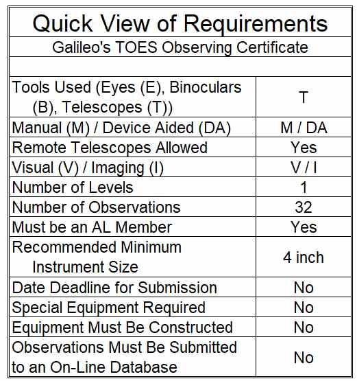 Submitting for CertificationThis program has a certificate (only) for those who successfully complete all of the observations. Once you have made the necessary observations, either send a copy of your log to the Galileo’s TOES Award Coordinator or have it reviewed and approved by an officer of your local club. That officer should then send an email to the Galileo’s TOES Award Coordinator with the observer’s name, club, e-mail address, and mail address. Also, send the name and email address of the person to which the certificate should be sent. |
