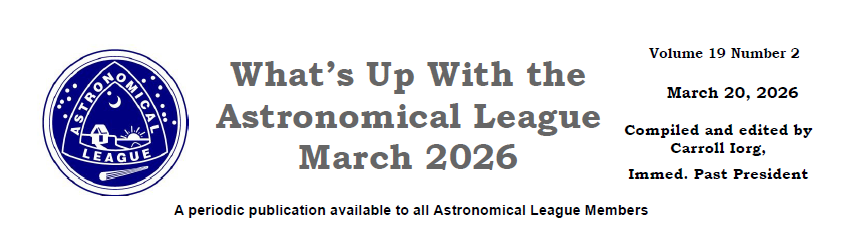 Please plan to join us for this month’s AL Live. It will be featuring John Goss and is entitled: “In Celebration of Global Astronomy Month Projects and Activities gtom your Astronomical League.”