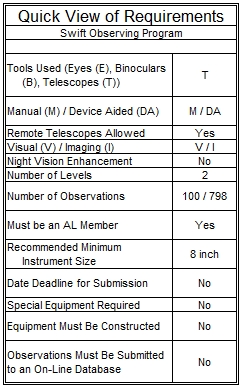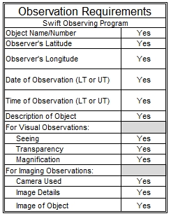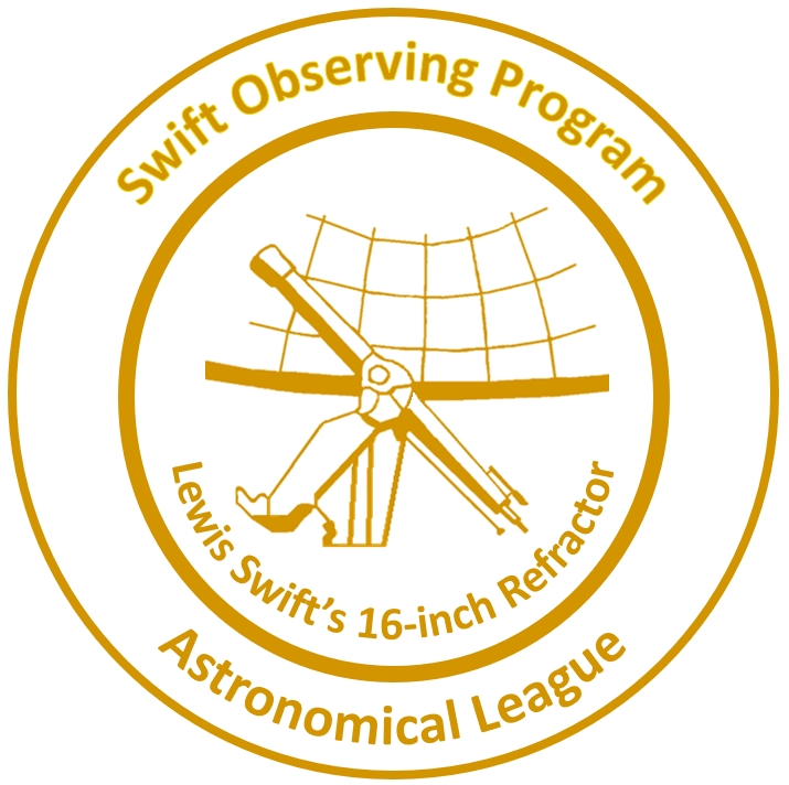 To receive your Swift Observing Program certificate and/or pin; mail or email a copy of your observations to the A.L.’s Swift Observing Program Coordinator. Include your name, mailing address, email address, phone number, and society affiliation. Indicate to whom the certification should be sent.
